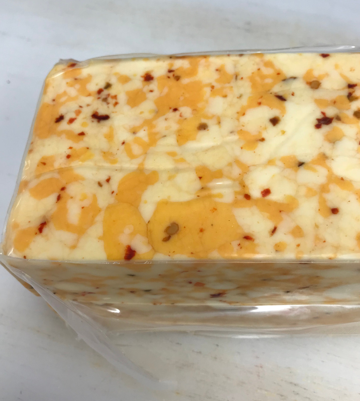 Colby & Monterey Jack Cheese with 3 Peppers (Habenero, Chipoltle, & Jalapeno), 1 lb cracker size, and 5 lb block.