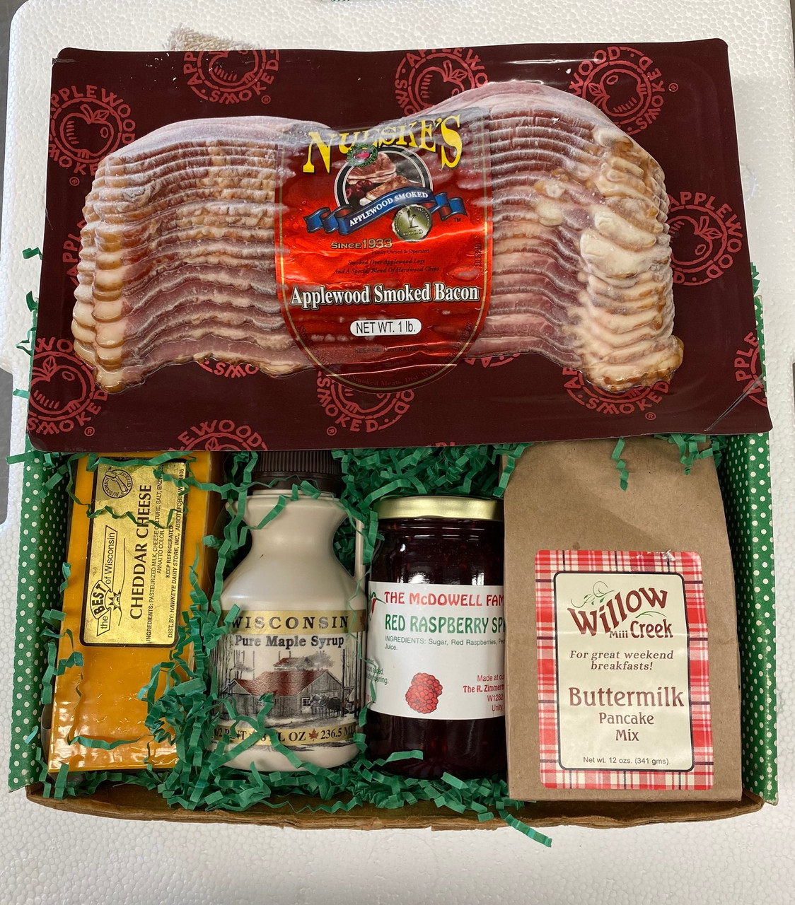 Apple wood smoked 1 lb. of Nueske’s bacon with butter milk pancake, 1 lb. Creamy Medium Cheddar Cheese, 10 oz. fruit spread and an 8 oz. Maple Syrup make a magical breakfast.