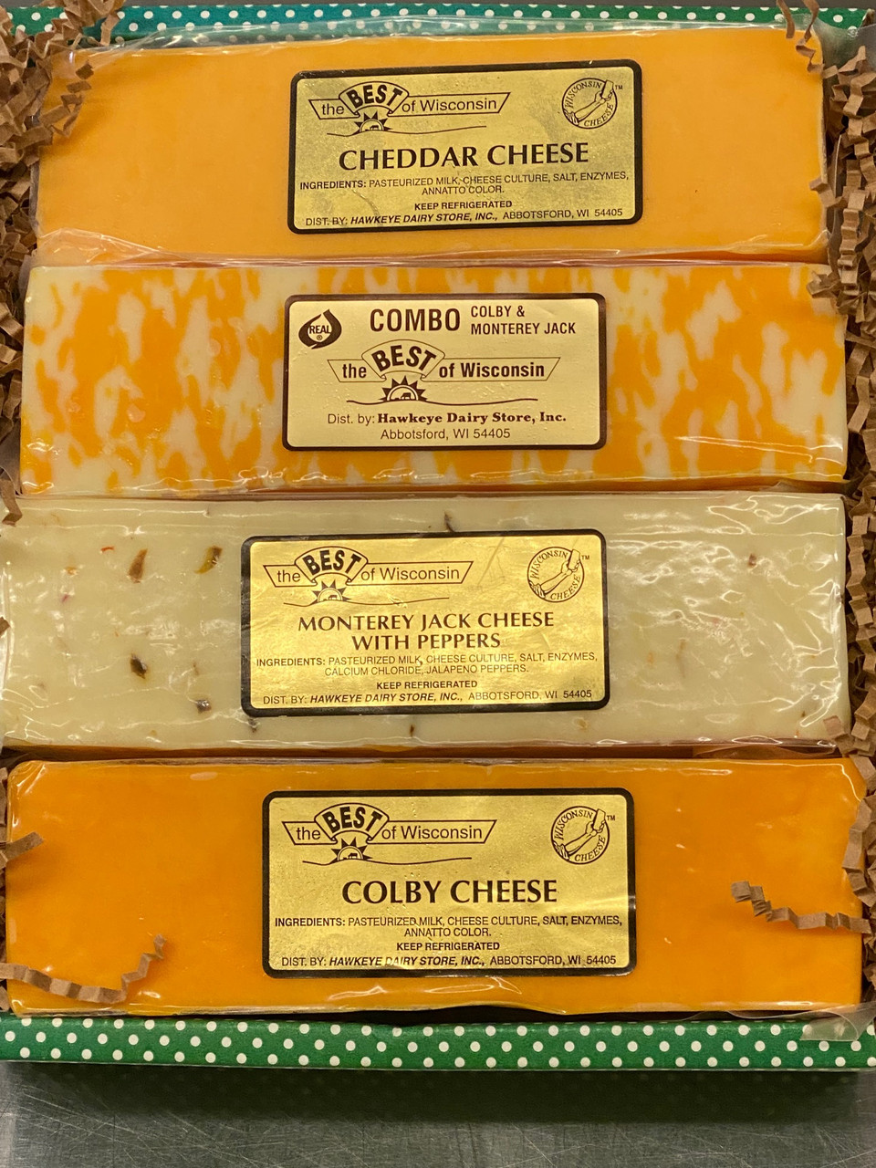 Some of our most popular Wisconsin cheese. Enjoy 1# of each Colby, Monterey Jack with Colby, Cheddar, and Pepper Jack cheeses. Sure to please palates of friends and family